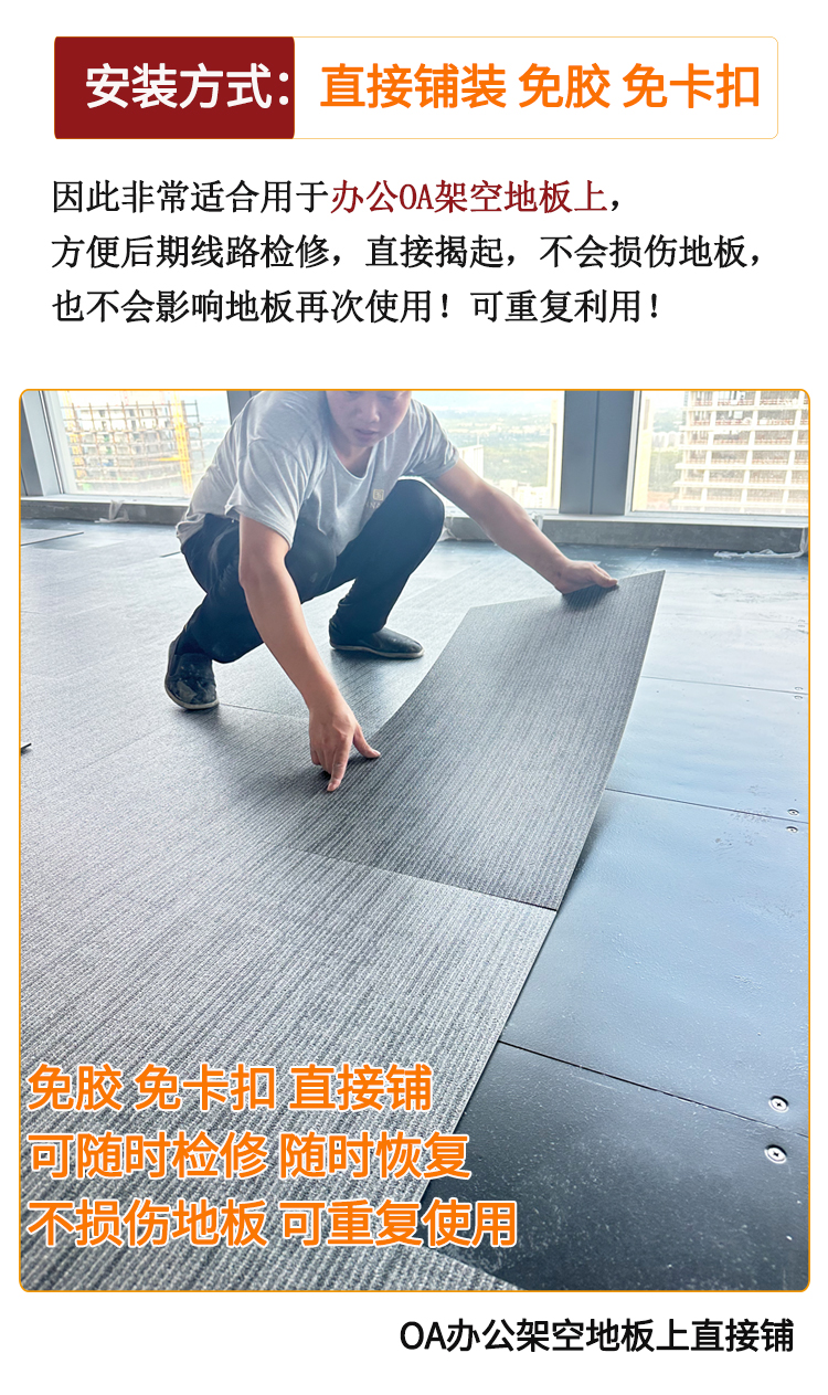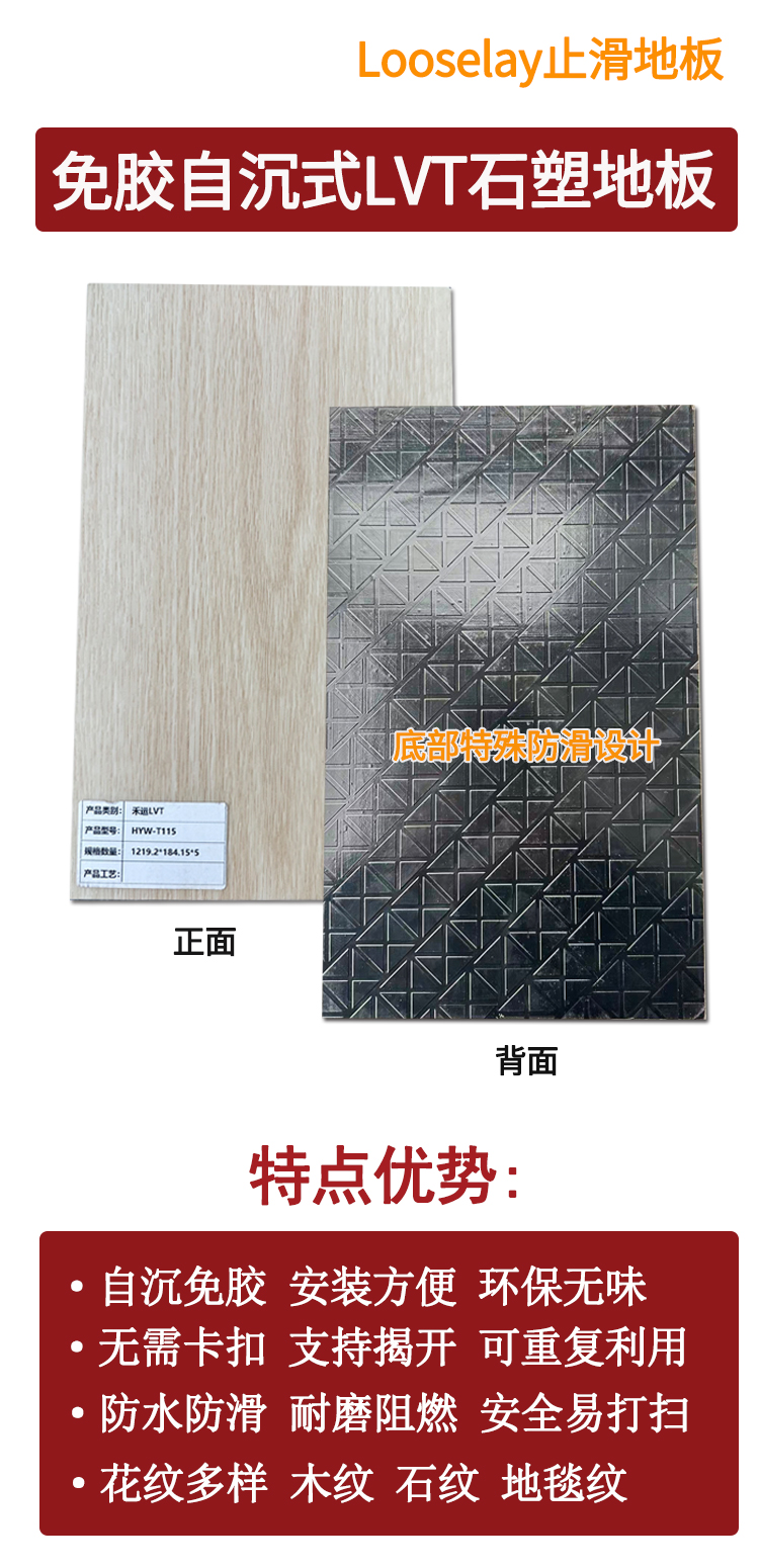 介紹:止滑地板又名自沉式LVT石塑地板,免膠、免卡扣安裝,0甲醛、無異味、環保耐用,OA架空地板基層專用